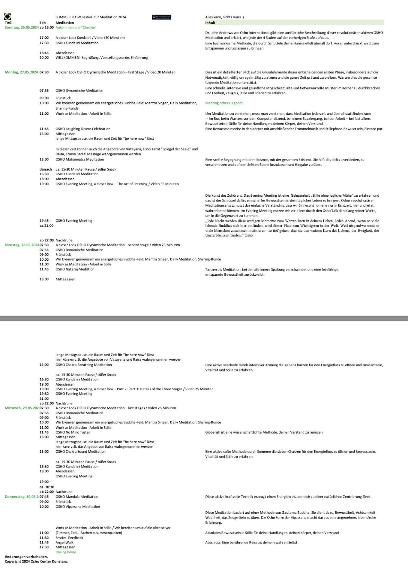 Wir kommen zusammen inmitten der wunderschönen Natur direkt am Bodensee und nehmen eine Auszeit vom Trubel des Alltags mit Meditationen für Tiefenentspannung, Freude und Wachstum. Oshos bahnbrechende Meditationstechniken mit Musik und Bewegung ermöglichen den TeilnehmerInnen zunächst den angesammelten Stress und die Anspannung loszulassen, um sich dann wieder mit dem Fluss des Lebens und der Freude zu verbinden. Die einstündigen aktiven Osho Meditationen – basierend auf jahrtausendealten östlichen Weisheiten und westlicher Wissenschaft – bieten auch Menschen, die in Meditation ungeübt sind, einen einfachen Zugang zum wahren Selbst als Quelle für Entspannung, Sein und Glückseligkeit.