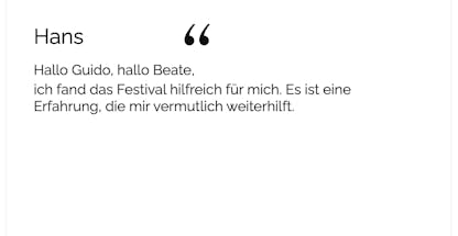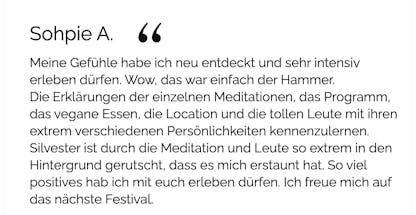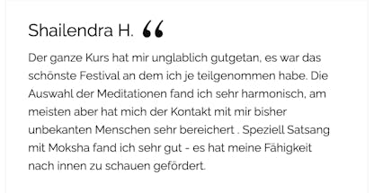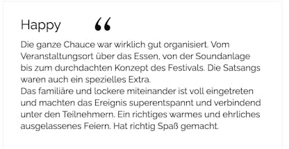 "Liebe Nanda, lieber Santosh, es war ein schönes Wochenende. Ich war begeistert und bin sicher, dass es auch für die Mutter/ Tochter Kombination Potential gibt, aber auch generell mit älteren Herrschaften." LG Sigi (War zusammen mit Tochter auf dem Festival)