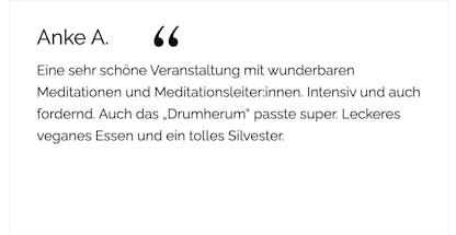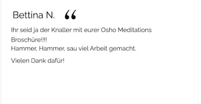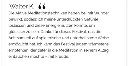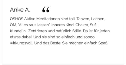 "OSHOS Aktive Meditationen sind toll. Tanzen, Lachen, OM, "Alles rauslassen", Inneres Kind, Chakra, Sufi, Kundalini, Zentrieren und natürlich Stille. Da ist für jeden etwas dabei. Und sie sind so einfach und soooo wirkungsvoll. Und das Beste: Sie machen einfach Spaß." Teilnehmerin Anke A.