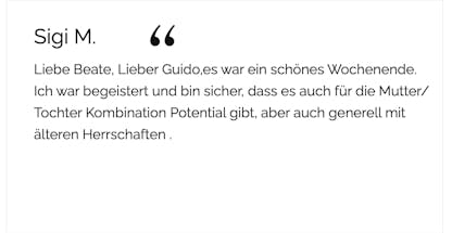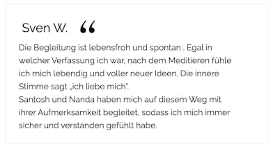 "Liebe Nanda, lieber Santosh, es war ein schönes Wochenende. Ich war begeistert und bin sicher, dass es auch für die Mutter/ Tochter Kombination Potential gibt, aber auch generell mit älteren Herrschaften."
